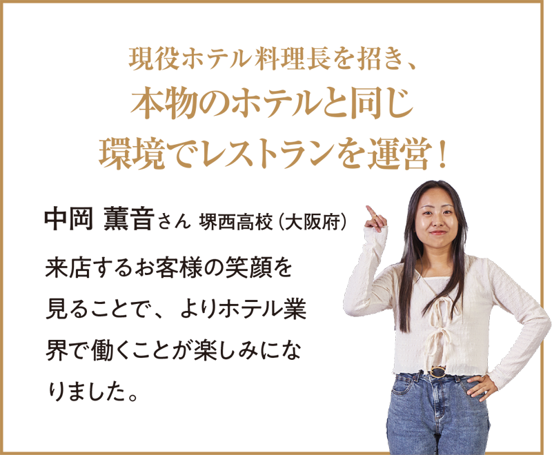 ホテリエの第一歩はホテルを知ることから。テーブルマナーを通じて、プロのホテリエによるサービスを体験し、プロのホテリエの指導のもとでホテル業務を実践的に学びます。